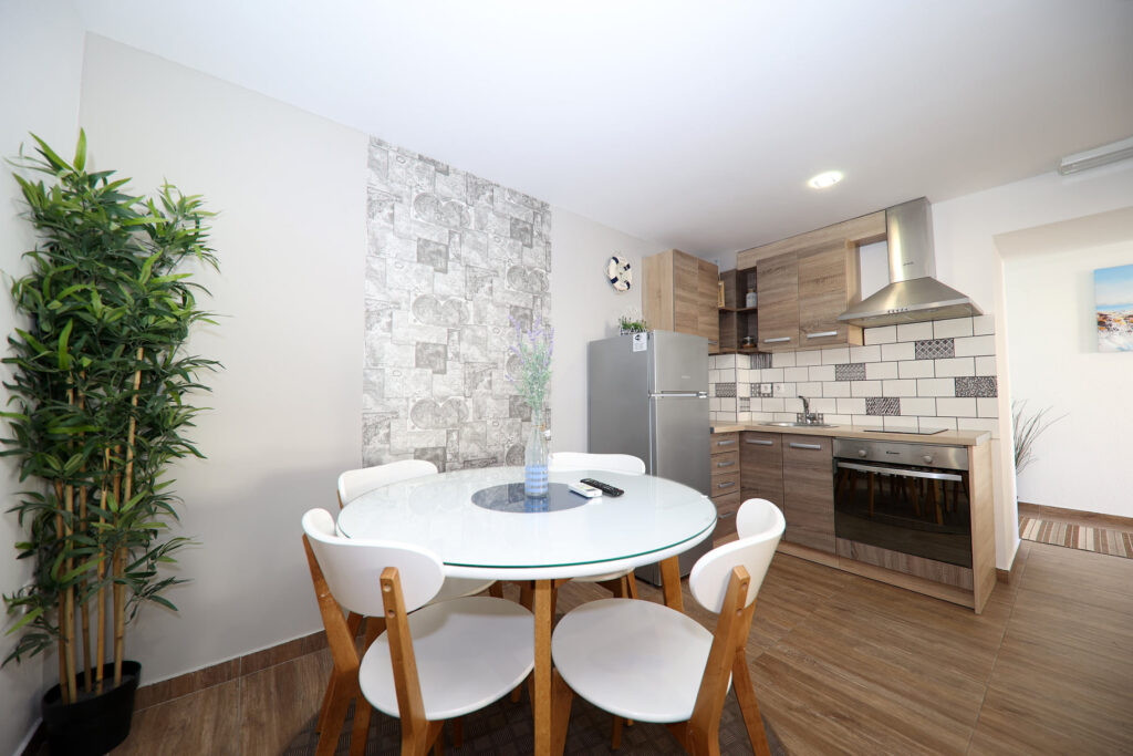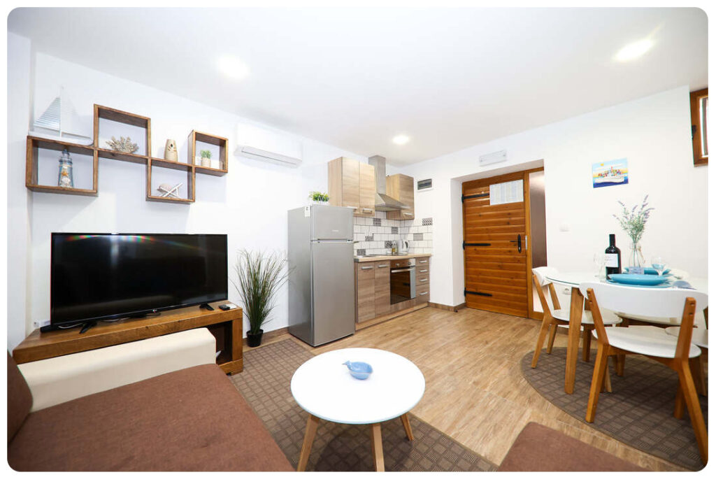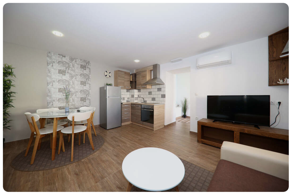 Apartment A2 is located on the ground floor, right at the entrance to the building. It has the most preserved stone arches and walls, thus conjuring a special atmosphere of living. It also has a special large and spacious arched bathroom with a large mirror. The living room has lots of wooden decorative wall elements and antique furniture.